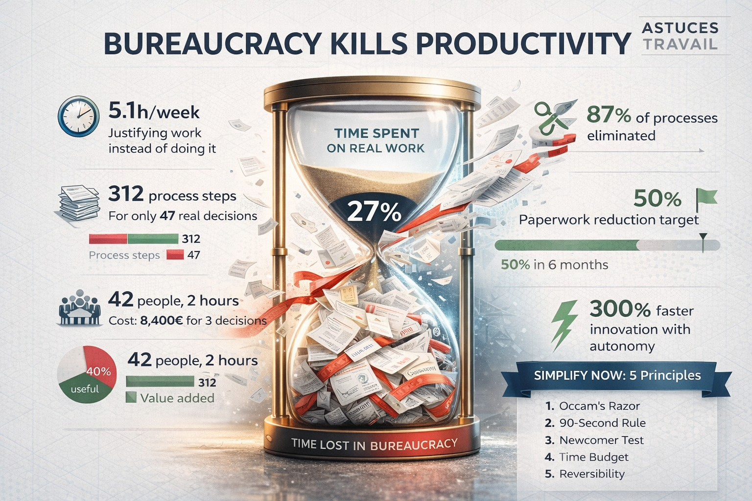 - Chiffre choc : Le travailleur français moyen passe 5,1 heures par semaine à justifier son travail (rapports, réunions de reporting, feuilles de temps) plutôt qu’à travailler réellement (source : DARES, ministère du Travail, 2024).